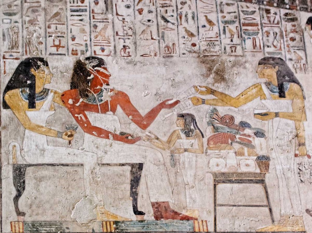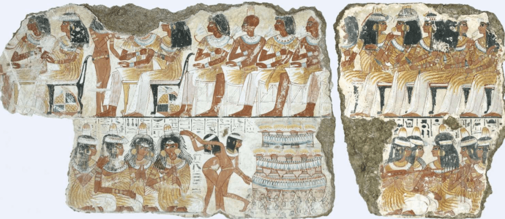 As I have said above the New Kingdom saw a flourishing in this cosmopolitan atmosphere with Egypt being more influenced by those outside its borders and so these poems and songs began to be written down and expanded as a genre. The poems were written on papyri or ostraca and date primarily to the 19th / 20th Dynasty and seem to have been read aloud with musical accompaniment from harpists, and so might have been a form of entertainment for the banquet goes[5]. Perhaps banquets like those shown on the walls of the Tomb of Rehkmire TT100 (Figure 1) and the Tomb of Nebamun (Figure 2).
