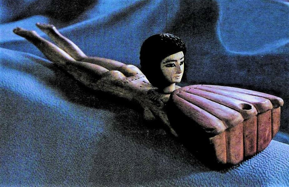 These cosmetics were applied with the hand, brushes and even ornate cosmetic spoons. Although these cosmetic spoons could also have been used to store fragrances in the form of pastes, dry powders or even grains such as incense which would then be scooped out of a large container and thrown into a fire[10]. These spoons were often carved to reflect nude female swimmers holding lotus flowers, birds and troughs, or women in marshes carrying jars of unguents, the god Bes and papyrus fronds all reflective of life and rebirth. A particularly famous example of one such spoons held in the Pushkin State Museum of Fine Art which shows a container in the form of a red lotus being carried by a nude swimmer, who some have said represents the sky-goddess Nut, made from ivory and ebony (Figure 6). In addition to being applied in this manner a popular trend in the New Kingdom appeared to be the use of unguent cones. Paint and reliefs from the beginning of the New kingdom show men and women with a lump of solid unguent perched on top of their heads, either bald or on top of a wig[11](Figure 7). This cone would then melt slowly releasing its perfume as it did so.