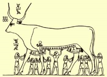 In other mythology histories their seems to be no permanent separation until the creator sun god Ra decided he wishes to leave earth after a rebellion by humanity[10]. In order to do so Nut takes the from of a cow, a new guise as ‘The Heavenly Cow’ (Figure 5), placing Ra in between her horns and carrying him to the heavens. This myth give rise to goddesses often being show with cow horns with a sun disc set within (Figure 6).
