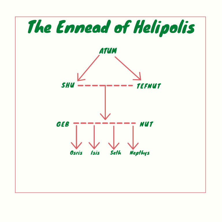 For the ancient Egyptians Nut was the personification of the night sky/ the heavens above and formed part of the Great Ennead of Heliopolis (Figure 3). An ennead is a term used to describe a group of nine gods, with the group at Heliopolis believed to be one of the earliest and most significant[2]. For Nut the group was formed of her parents (Shu and Tefnut), her brother/husband (Geb) and their children (Osiris, Isis, Seth and Nephthys).