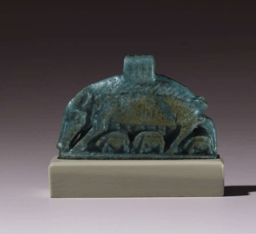 She played an important cosmogonic role, for alongside being the mother of the great sky whose laughter was the thunder and whose tears where the rain she was believed to swallow the sun and other heavenly bodies in the evening and give birth to them again at sunrise[3]. Her blood said to give the sunrise its colour. As a result, one of the titles associated with Nut was being the ‘female pig who eats her piglets’, but this isn’t viewed in a negative manner[4]. Amulets of Nut in sow form with piglets around her appeared during the Third Intermediate Period (ca. 1070–664 B.C.) and wear intended to imbue the wearer with her fertility[5](Figure 4). But I digress from her role in mythology with that snippet.