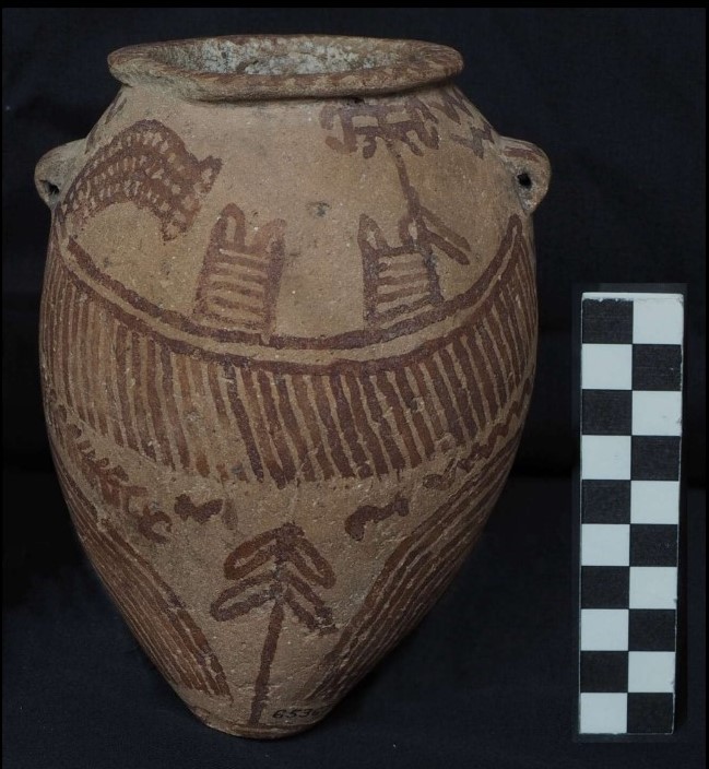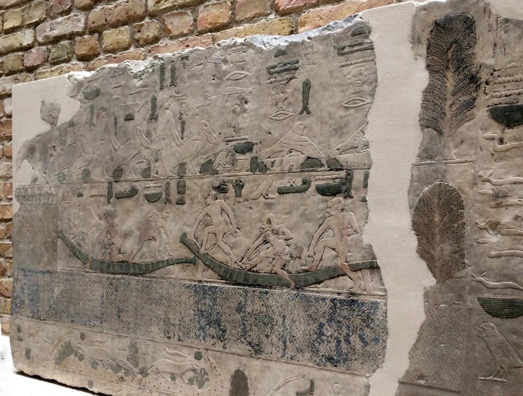 Given the integral role that the river Nile played in the life of the ancient Egyptians from a practical and religious standpoint, it is no wonder that boats and various modes of water transportation have been used as early as the Gerzean period or Naqada II period (c.3500-3100)[1]. Papyrus skiffs made by binding the long stalks together were used from the Predynastic era for local transport and hunting (Figure 1). As shown in tomb art, the boats used for pilgrimages and funerals take a distinctive elongated U shape with upturned ends; these may originally have been made from reeds and were perhaps translated later into wood[2]. Painted pottery of the Naqada period also shows more elaborate boats, in all likelihood made using papyrus, boasting multiple sets of oars (Figure 2).