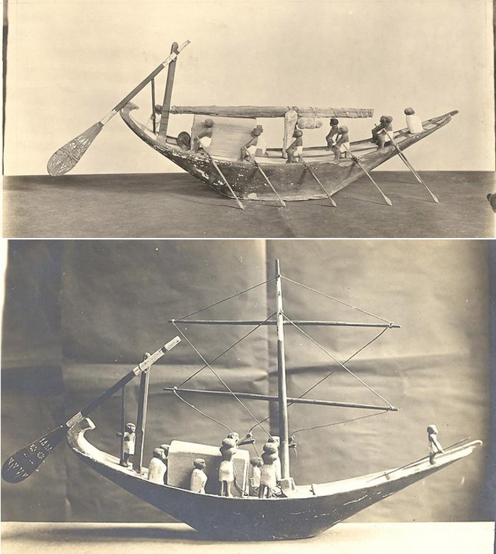 Bottom model shows a boat with four sailors hauling sail and four sitting at the sides of the cabin. There is also a lookout man, and a steersman seated on a chair in front of the cabin. Manchester Museum 4742 http://harbour.man.ac.uk/mmcustom/Display.php?irn=100267&QueryPage=%2Fmmcustom%2FEgyptQuery.php
