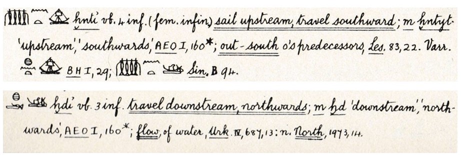 The prevailing winds of Nile valley come from the North and so the sailing boats could propel boats travelling south by those winds whilst those travelling north would rely on the use of oars and the currents[3]. The use of boats as a form of travel was so ingrained in the psyche of the ancient Egyptian that it was natural for boat travel to form part of the hieroglyphic language and religious rhetoric. In hieroglyphs travelling north even in the case of overland travel consists of a boat with sails down and lowered oars whilst travelling to the south the boat with its sails up (Figure 3). In the religious views of the ancient Egyptians, the boat was the mode of transport for the sun god Ra as he travelled a night through the underworld to sail the sky ushering the sun across the sky during the day(Figure 4).