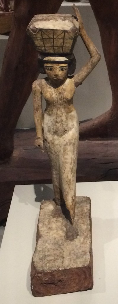 The dresses worn by women also change alongside adopting new hairstyles. Now upper-class women’s dresses could be made of cotton although still form-fitting there were often sleeve with a plunging neckline with the addition of a clasp necklace around her neck[13] (Figure 8). Another style of dress that developed in this time period was an ankle-length dress that stopped around the waist which was then held up with thin straps that ran over the chest and faster over the shoulders at the back[14] ( Figure 9). It should be made clear by this point that although I am describing linen clothing and for the most part the colour is injected into these outfits by accessorizing the ancient Egyptians did wear colourful garments. A colourful example is that of an offering figure found in the Tomb of Meketra dating to the early Middle Kingdom (Figure 10/7). This statue has always been a favourite of mine due to the details is shown from the addition of pink in the corner of this woman’s eyes and the array of bright colours her dress shows. Striding forward with her left leg, the woman carries on her head a basket filled with cuts of meat. The figure’s iconography is well known from reliefs of the Old Kingdom in which rows of offering bearers were depicted. The woman is richly adorned with jewellery and wears a dress decorated with a pattern of feathers or some have said this could be a heavily beaded dress overlaid a simple garment, nonetheless this kind of garment is often associated with goddesses and high powered women[15].
