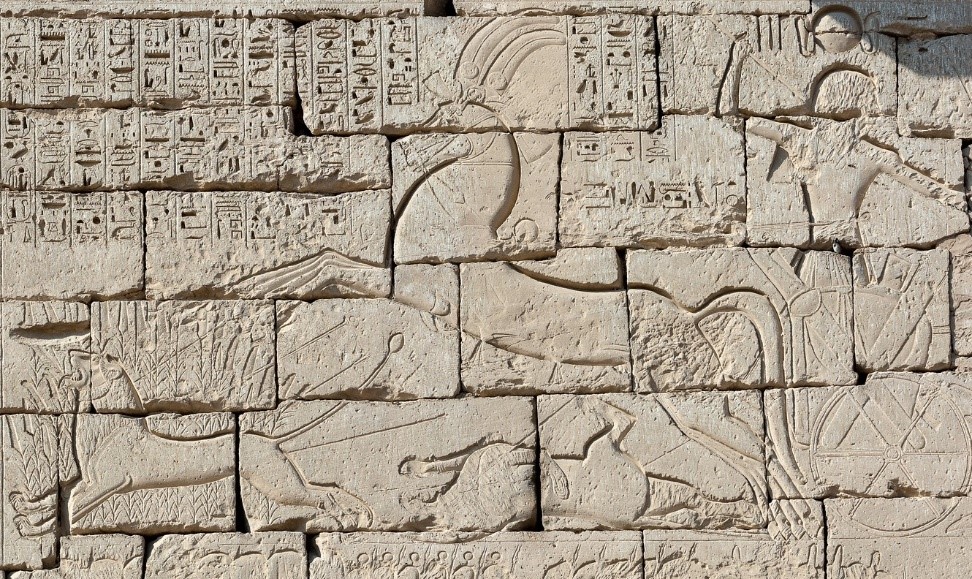 Pharaohs also took part in lion hunts Figure 3-5. Amenhotep III seemed to be a p[artucialr love of lion hunting and other game hunting as a sport. Among over 200 commemorative scarabs Figure 3 that date to his reign generally covers five different events; Bull Hunts, lakes, the arrival of and marriage of his new wife Gilukhepa and finally lion hunts. 123 of the 200 of the scarabs records the number of lions 102 that were slain by Amenhotep ‘with his own arrows from his first regnal year up to his tenth[5]. The king’s success as a hunter stood for his victory on the battlefield and symbolized the triumph of order, embodied in the divine rule over the forces of chaos. The ostracon in Figure 4 shows a hunting scene. Showing an unidentified Ramsesside king is represented symbolically slaying the enemies of Egypt in the form of a lion. The hieratic text reads: “The slaughter of every foreign land, the Pharaoh—may he live, prosper, and be healthy.”[6] Figure 5 from Medinet Habu again shows a pharaoh this time Ramesses III successfully felling a lion during a hunt.