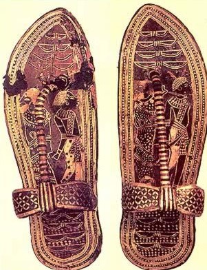 By the pharaonic period, the number of lions in ancient Egypt had declined greatly compared to numbers during Predynastic times. But even at the outset during predynastic Egypt, the symbolism of the lion had become established quickly. The possible connection between the king and the lion could stem from the hunting of these animals by chiefs during the predynastic period [1]. The significance of the lion then continues throughout pharaonic Egypt and is often shown as being both a representation of the king or the prey of the king. Figure 1 shows the image of a lion, as the pharaoh, subjugating a Nubian, a group considered to be one of the traditional enemies of Egypt and shown frequently in Ramesside era art especially pieces belonging to the reign of Rameses II[2]. The usual representation found in art is a bound Nubian kneeling before a lion that holds the back of the man’s head in its jaws. This image creates a powerful feeling of dominance by Egypt over their enemies. In general the enemies of Egypt as referred to as the Nine Bows. The Nine Bows is a broad term and should not be taken literally but is a catchment term used to cover all potential enemies of Egypt. Nubians and Asiatics always appear among the enemies their arms tied behind their backs, are depicted on many temple walls[3]. In Egyptian art, the bows were frequently depicted in such a way that (a representation of) the king literally walked on them, thus under the feet of a statue of the king, on the base of a throne or, as for example with Tutankhamun, on sandals[4] (Figure 2). Or in the case of this handle shows the subduing of such enemies. But the opinion of the Ancient Egyptians of their enemies and warfare should be left for another time. Back to lions.