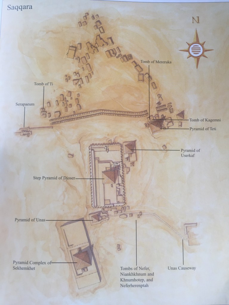 The site of Saqqara was the main cemetery for the ancient city of Memphis (24 km south of modern Cairo) used by kings/ their officials from the First dynasty t the Christian era in total it covers 6 km long 1.5 km at its widest point (Figure 1). The step pyramid complex is made of two different types of buildings some practical and others dummy buildings. Jean-Phillippe Lauer felt that the dummy buildings symbolically represented the ancient city of Memphis so that, like the pyramid being stocked with food and drink for the afterlife, he was also provided with a capital city for eternity[3]. The step pyramid itself is a tower built in 6 stages based on a mastaba 63m square by roughly 8m tall which further covers a shaft 28 m deep that leads onto a network of subterranean rooms[4](Figure 2). A mastaba is an Arabic term applied to the Egyptian-style tomb in which a superstructure resembles the low mudbrick benches outside Egyptian houses[5]. These tombs often had sloping walls so that the roof was smaller than the base and was used for both royal and non-royal burials from the early dynastic period but only for private burials by the time of the Old Kingdom[6]. For reasons we do not fully know Imhotep took these mastaba structures and decided to stack them on top of each other gradually reducing them in size and creating the iconic shape of the step pyramid. This pyramid formed part of a wider plan by its architect. Imhotep built the complex as a mortuary shrine for Djoser. Still, it became a stage and an architectural model for the spiritual ideals of the Egyptian people- later pyramids and obelisks seem to suggest them to be the physical manifestations of the sun’s rays. Margaret Bunson writes ‘The Step Pyramid was not just a single pyramidal tomb but a collection of temples, chapels, pavilions, corridors, storerooms, and halls. Fluted columns emerged from stone according to his plan.’[7] In a recent post about the Heb Sed festival, or royal jubilee, you can see how this steppe pyramid complex played a role in the celebrations and how part of that celebration included the pharaoh running the ceremonial complex. The high relationship esteem that Imhotep is held in by King Djoser is clear in statutory fragments found at Saqqara. In these fragments, Imhotep is granted the unique privilege of being named alongside Djoser in formal statutory (Figure 3).